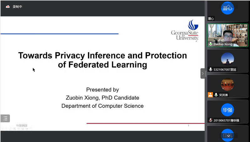 2022年11月3日,beat365英国官方网站举行了智汇论坛2022年第五期(总第九期)活动。本次活动邀请美国佐治亚州亚特兰大佐治亚州立大学计算机科学系博士候选人熊作彬以“联邦学习中的隐私攻击与隐私保护”为题作专题讲座。