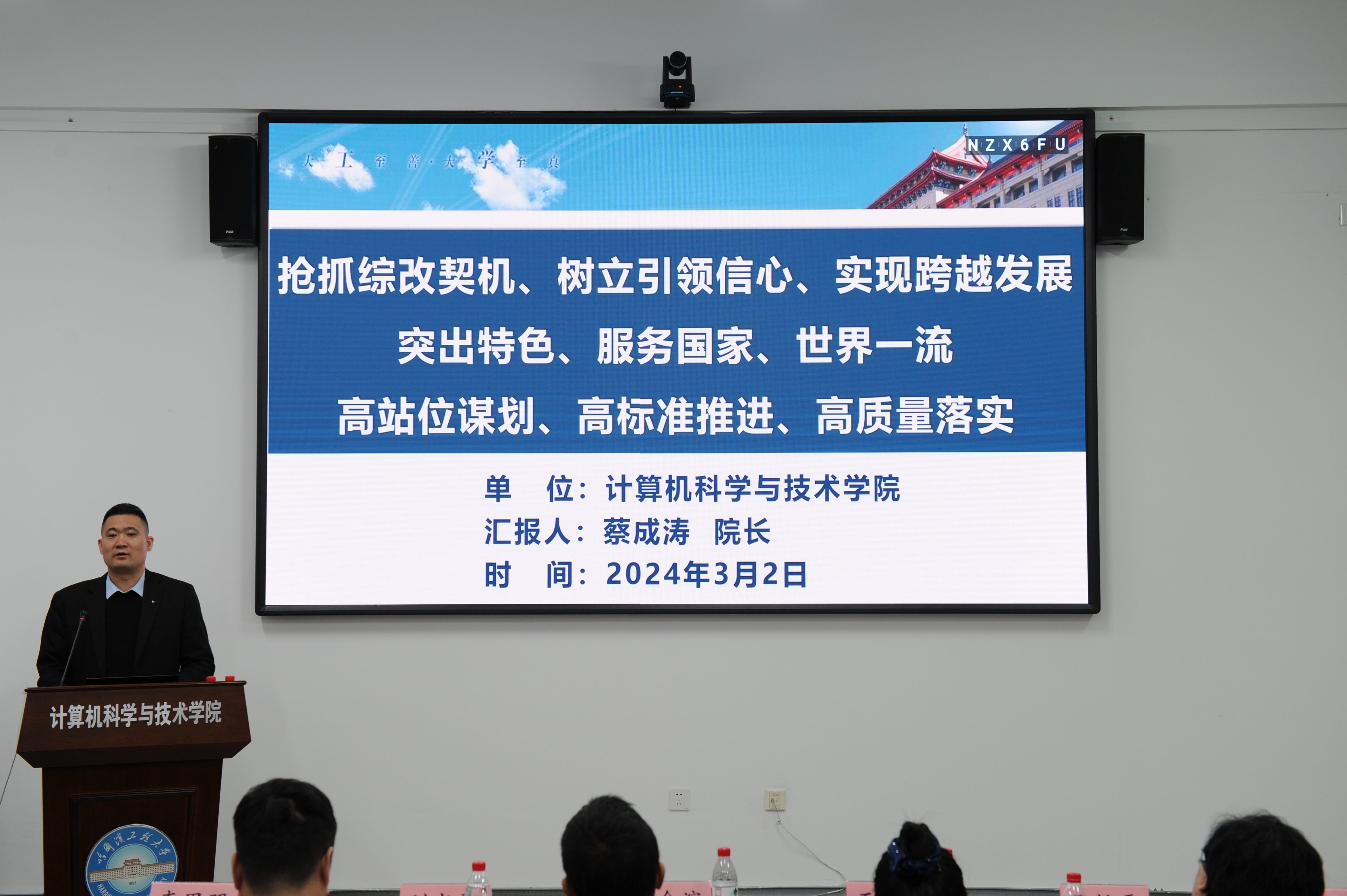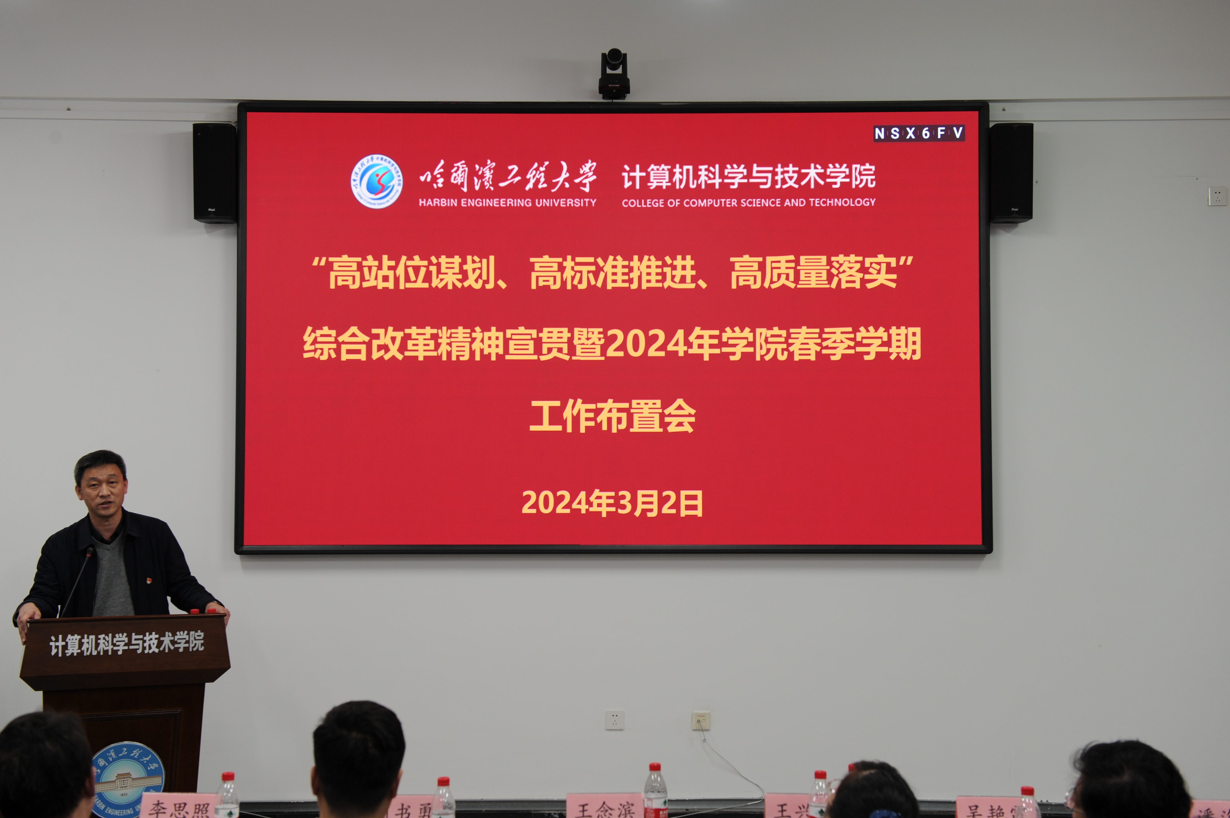 随后,蔡成涛院长代表学院作2024年学院春季学期工作部署,他指出,学院要高站位谋划、高标准推进、高质量落实,以综改为抓手,高质量推进2024年度工作,并分别对师资队伍、本科生教育、研究生教育、科学研究、国际合作、“学院+书院”双轮驱动、高质量完成新一轮本科教育教学审核评估、硕博研究生联合培养以及深化沉浸式入企等6项重点工作和97项基础性工作的具体举措进行了布置。最后,蔡成涛院长希望全院教职员工齐心协力,在国际化全球化发展、战略科学家和国家级领军人才引陪方面实现新突破。