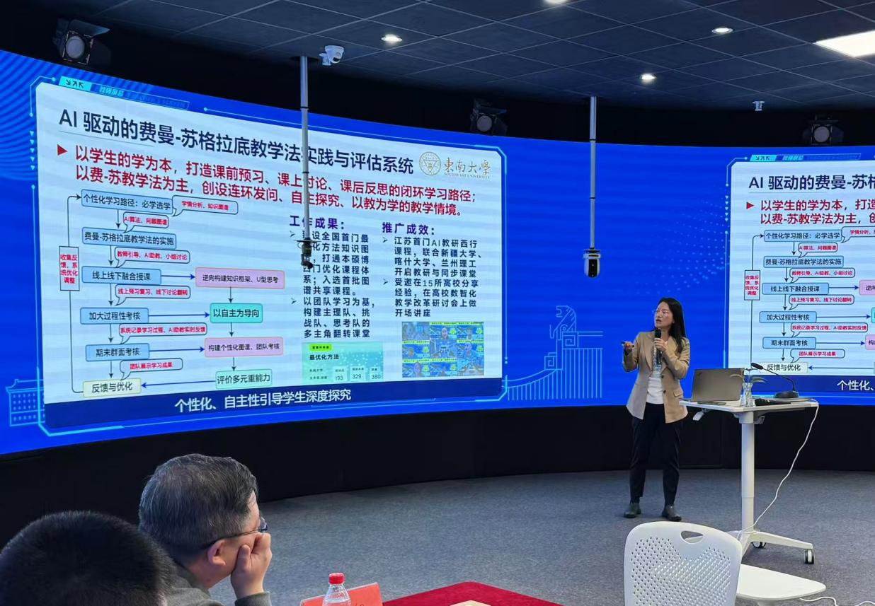 本次工作坊的特约专家、东南大学关秀翠教授以《AI 智慧课程建设与应用》为题作智慧课程建设案例分享。关教授围绕《最优化方法》的建设理念,深入介绍了课程知识图谱建设与应用的全流程,她强调了构建知识图谱是破解课程知识体系复杂难题、实现个性化教学的关键。关教授详细介绍了智慧课程建设的实施路径,即通过提炼课程核心概念与算法原理,构建逻辑清晰的知识网络,实现知识的动态更新与智能推送,精准对接学生学习需求;基于知识图谱并结合费曼—苏格拉底教学法,对学生学习数据的深度分析,动态调整教学策略,“以问促学、以学促思”,显著提升了学生的自主学习能力与知识应用水平。这些前沿理念与实际案例,使参加活动的各位教师受益匪浅。