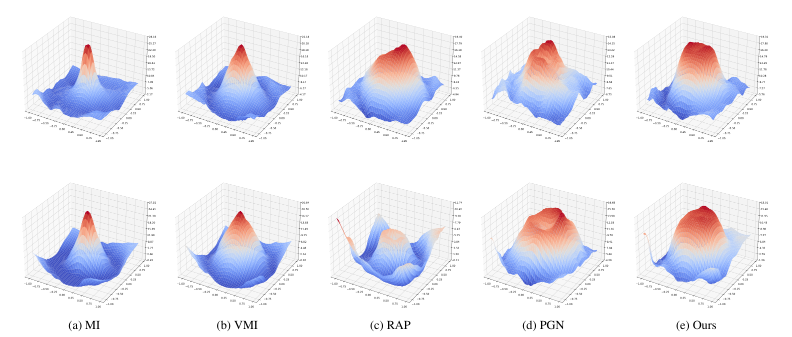 论文成果提出使用损失函数的二阶Hessian Trace作为损失面曲率感知的正则化项。为了提高计算效率,论文引入了一种基于随机估计和有限差分的近似Hessian Trace计算方法。同时,论文从理论和实验上证明,靠近局部损失最大值的对抗样本的Hessian Trace始终为负数。基于此,论文提出了Negative Hessian Trace Regularization(NHTR)以提高对抗样本的可迁移性。实验结果表明,现有的一阶正则化方法相比,该创新方案优化对抗样本至更平坦的损失极大值上,攻击成功率也显著提高。