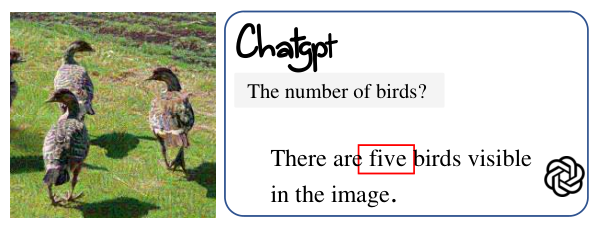 此外,作者还针对大型视觉语言模型进行了攻击实验,例如利用本文生成的对抗样本攻击ChatGPT,导致ChatGPT 错误地识别了对抗样本中的鸟类数量。