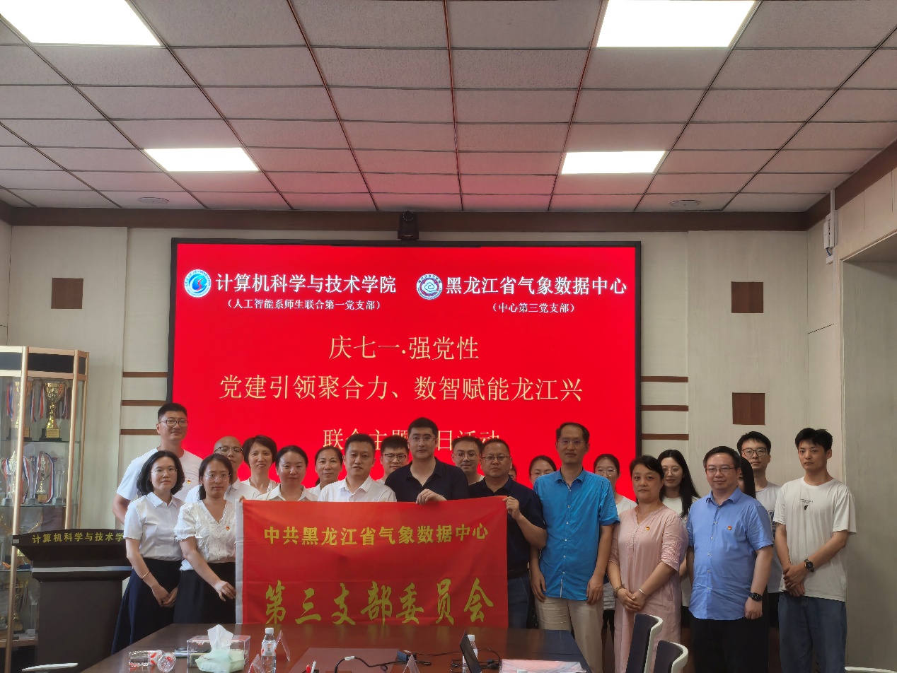 为庆祝中国共产党成立104周年,强化党的作风建设,扎实推进党性教育与业务工作深度融合,7月3日,计算机学院人工智能系师生联合第一党支部与黑龙江省气象数据中心第三党支部组织开展了“庆七一·强党性:党建引领聚合力、数智赋能龙江兴”联合主题党日活动。活动由人工智能系师生联合第一党支部书记王勇主持,黑龙江省气象数据中心党委副书记姜慧、中心副主任黄博、计算机学院党委副书记刘正及两支部20余位党员参会。
