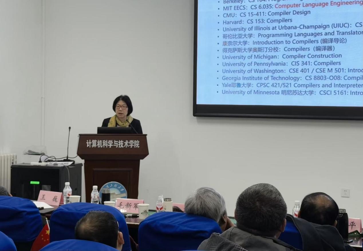 张莉教授报告的题目为《“101”计划编译课程建设及虚拟教研室建设》,她着重分享了101计划编译原理课程建设及其虚拟教研室的建设情况。比较分析了国内外编译课程内容,设计了编译课程知识体系设计和典型教案,分享教材建设;探索了虚拟教研室的组织形式、建设模式,已取得的各类成果及其成果的推广情况,以及目前结合人工智能技术开展的一些尝试。