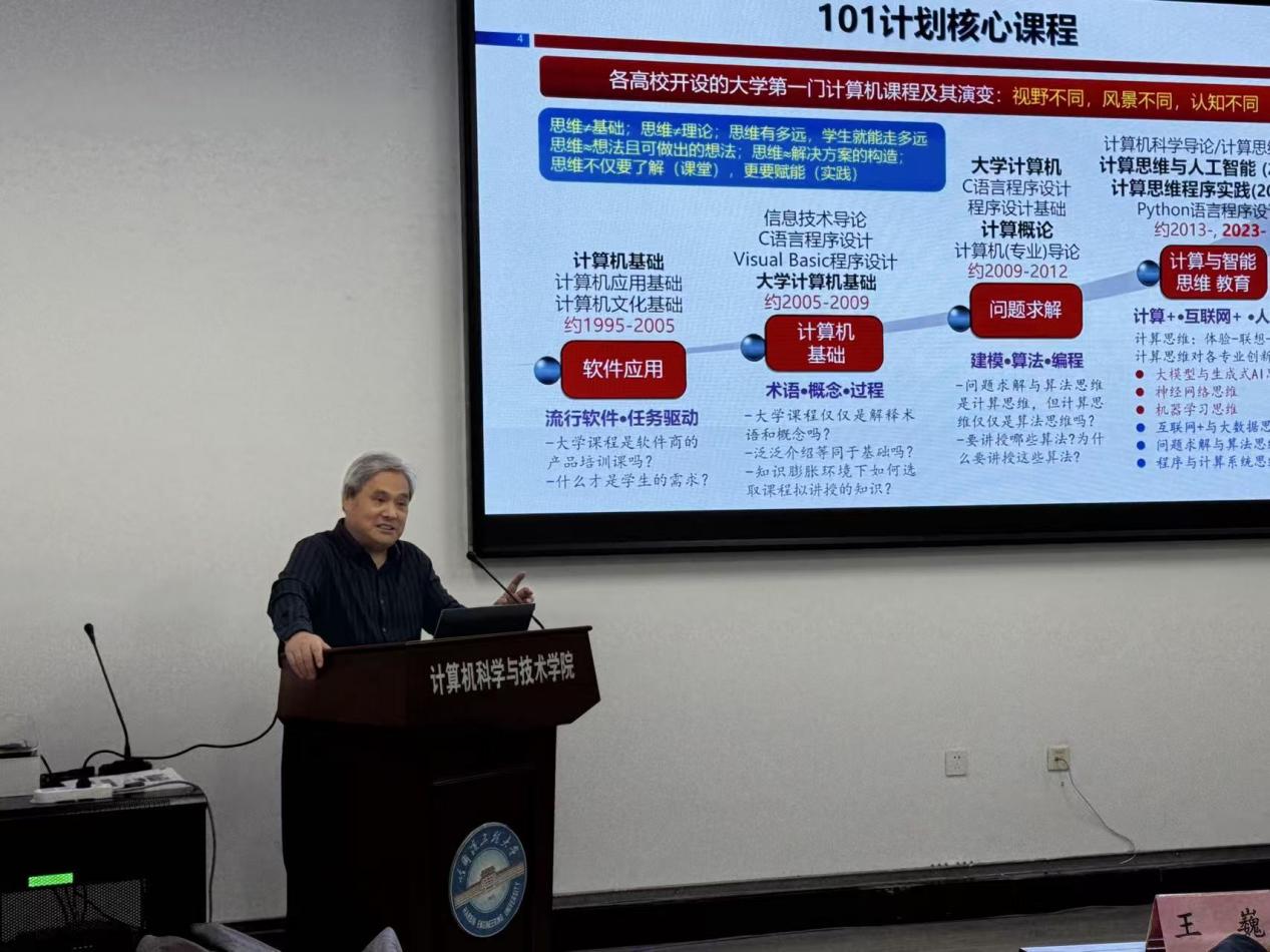—以大学第一门计算机类课程建设为例》为题,介绍了他负责建设的《计算概论(计算机科学导论)》课程,即大学第一门计算机类核心课程取得的相关工作成果,主要内容包括101计划核心课程建设思路与成果,知识图谱、AI助教与数智课程iMOOC。